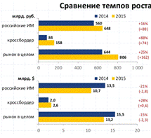 В 2014 году, всего - 235 млн. продаж, из них внутри страны - 160 млн., импорт - 75 млн. За 2015 год: всего - 260 млн., (рост 12 %), из них внутри - 125 млн., (падение 22%), импорт - 135 млн. (рост 44%). Datainsight.ru в своем отчете показала темпы роста в сравнении 2015 и 2014 гг., а так же в млрд. руб. и млрд. долларов (рис. 2.4). Как видно из рис рост рынка составил 2% в млрд. руб., а в млрд. дол. сократился на 15%, что связано с ростом иностранной валютой и нестабильной экономической ситуацией в стране.