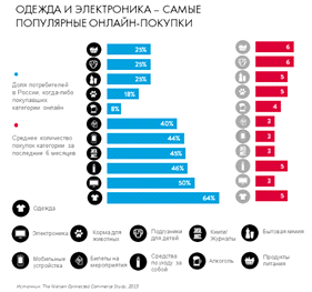 Несмотря на активное развитие торговли в интернете, российские потребители не теряют внимания к розничным магазинам и выбирают баланс между онлайн- и офлайн-шопингом. Россияне видят множество преимуществ в совершении покупок в сети Интернет, однако большинство испытывают опасения по поводу качества товаров и безопасности данных при оплате (70% онлайн-россиян оплачивают заказы, сделанные в сети, наличными при получении - это один из самых высоких показателей в мире. Причина ограниченного использования безналичного расчета - в недоверии к сохранности данных банковских карт.