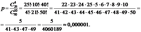 Задание 2. В партии из N = 50 изделий M = 25 имеют скрытый дефект. Какова вероятность того, что из взятых наугад n = 10 изделий дефектными окажутся m = 4 изделий?