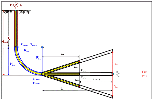 Температура на устье 290 К, глубина вертикальной части ствола 1450 м, радиус кривизны 130 м, угол охвата заданного отклонения от вертикали α=900, длина горизонтального ствола 400 м, длина НКТ горизонтальном стволе 150 м; диаметр НКТ 0,073; 0,100 м (коэффициент абсолютной шероховатости 0,0001м); диаметр обсадной колонны 0,178м (коэффициент абсолютной шероховатости 0,0001м). Пластовая температура 305 К, пластовое давление 11 Мпа.