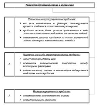 Объектом для экономико-математического моделирования является полностью структурированные проблемы, характеристики которых приведены в блоке 1 рисунка 1.3. Частично или слабо структурированные проблемы, определяются во втором блоке, является объектами для методов системного анализа, сочетающих неформализованные решения специалистов с модельными расчётами по отдельным предметам [14, c. 31].