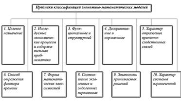 Для классификации математических моделей экономических процессов и явлений используются разные признаки (рисунок 1.4.) [2, c. 17].