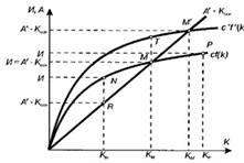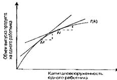 Как видно из рисунка 2.1, тангенс угла наклона графика производственной функции, выражающий величину предельной производительности капитала, уменьшается по мере подъема по кривой f(k) (точки M и N), что указывает на снижение предельной производительности капитала по мере его возрастания.