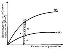 Это значит, что на графике (Рисунок 2.3) кривая выбытия (А′•Косн) и кривая инвестиций [сf(k)] должны будут пересечься в точке М, где инвестиции равны выбытию, а капиталовооруженность остается неизменной. Поскольку выбытие капитала идет равномерно, линия имеет постоянный угол наклона. Несмотря на это, норма сбережений (С), объем инвестиций (И) изменяются неравномерно ввиду неравенства значений объема выпуска при различных уровнях капиталовооруженности.