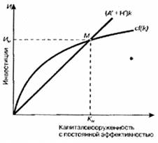 Новый график (рисунок 2.6) отличается от предыдущего только включением дополнительного элемента - технического прогресса. Под воздействием роста технического прогресса требуется меньший объем капитала (К). При устойчивом состоянии экономики инвестиции [с f (k)] в точности компенсируют уменьшение К вследствие его выбытия, роста населения и технического прогресса.