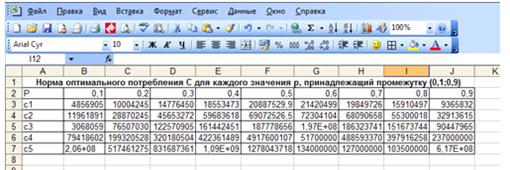 Найдем норму потребления с для каждого значения p, принадлежащий