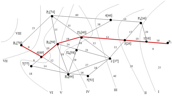 Рисунок 1 - Определение кратчайшего по стоимости пути между пунктами R1 и Р3 по сети автомобильных дорог методом