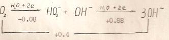 После исследований Багоцкого, также выполненных в щелочных растворах(аон- ≥ 0,09), но уже на ртутном электроде, не осталось сомнений в том, что в щелочных растворах на некоторых электродных материалах редокс система О2/Н2О2 является обратимой (либо достигается очень близкое к обратимому состояние). Это особое положение щелочных растворов, по сравнению с кислыми и нейтральными, объясняется следующим образом: