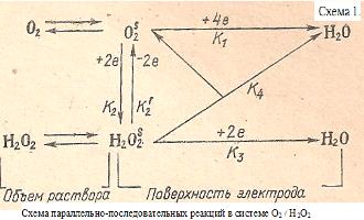 В кислых и нейтральных средах скорость восстановления кислорода во много раз превышает скорость анодного окисления перекиси, что и является причиной необратимости. По мере повышения рН скорость катодной реакции не меняется (ионы водорода не участвуют), а анодной реакции резко возрастает.