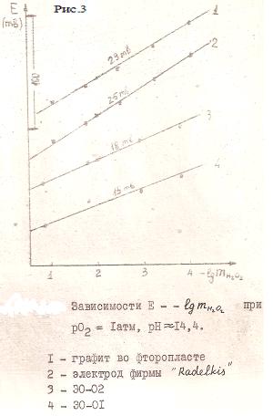Следует заметить, что нарушение линейной зависимости Е=f (-lg m Н2О2) с уменьшением рН имеет место и на графитовых электродах, но в значительно более сильной степени, как в области концентрированных, так и в области разбавленных растворов перекиси водорода.