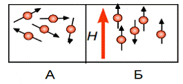 Рис.1.3.1. Ориентация магнитных моментов электронов А) в отсутствии внешнего магнитного поля Б) во внешнем магнитном поле Н