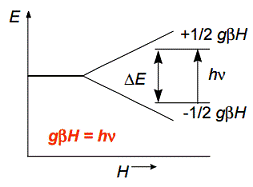 Если теперь на систему электронов, находящуюся в магнитном поле, подать электромагнитную энергию, то при определенных значениях величины энергии падающего кванта будут происходить переходы электронов между энергетическими уровнями. Необходимым условием переходов является равенство энергии падающего кванта (hν) разности энергий между уровнями электронов с различными спинами (gβH).