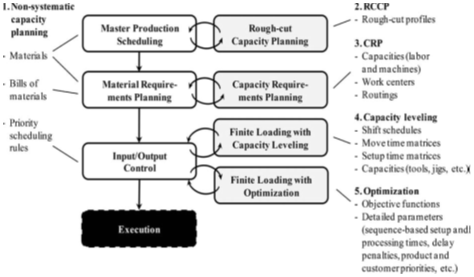 Планирование потребности в производственных мощностях (capacity requirements planning, далее CRP) предлагает более детализированную технику удостоверения в осуществимости материальных планов. Вычисления, согласно CRP, проводятся не только для конечных продуктов, но и для сборочных узлов. Кроме того, данные по маршрутам позволяют контролировать использование отдельных ресурсов и эффекты от изменения порядка операций, времени наладки оборудования и размеров партии. Таким образом, CRP корректирует упрощения RCCP и помогает создать более надежные планы. Тем не менее, неавтоматизированная работа продолжает играть главную роль, так как люди, ответственные за планирование, стараются сделать так, чтобы планы соответствовали лимитам производственных мощностей.