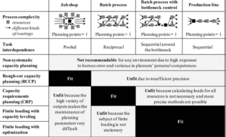 Методы планирования не исключают друг друга. Напротив, некоторые методы могут быть использованы одновременно для различных целей. Так менеджеры предприятий могут использовать RCCP для оценки планов продаж, специалисты по составлению графиков производства могут использовать CRP для контроля над своими действиями, а планировщики производства - методы ограничения нагрузки на производственные мощности для наиболее важных ресурсов. Тем не менее, почти всегда может быть определен основной метод планирования. Это тот метод, который определяет выпуск продукции, с которой и связывает себя функция производства.