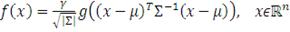 Класс эллиптических распределений включает, главным образом, класс симметричных распределений, которые являются довольно популярными в современных финансах. Они позволяют моделировать многомерные экстремальные события, формируя зависимость, не совпадающую с зависимостью многомерного нормального распределения, и использовать распределение с большим эксцессом, чем эксцесс нормального распределения. Таким образом, эллиптические копула-функции - это попросту копула-функции многомерных распределений эллиптического типа. Эллиптические распределения определяются следующим образом: