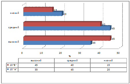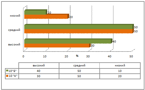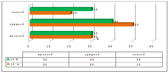 Высокий уровень показали 30 процентов в обоих классах. Средний уровень готовности показали 50 процентов в контрольном и 45 процентов учащихся в экспериментальном классе. К сожалению, низкий уровень составил - 20 процентов в экспериментальном классе и 30 процентов в контрольном.