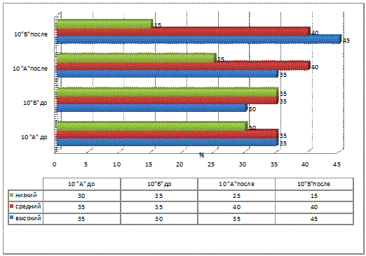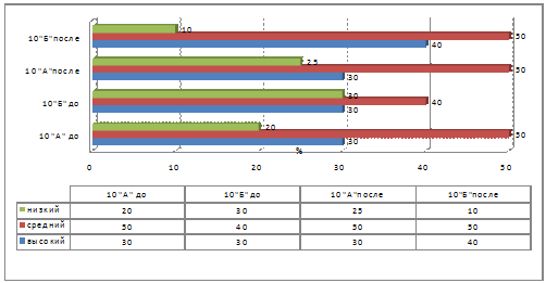 Если в экспериментальном классе высокий уровень наблюдается у 40 % учащихся, то в контрольном классе этот уровень наблюдается лишь у 30 %. Низкий уровень готовности в экспериментальном классе снизился с 30 % до 10 % , в контрольном же классе этот показатель снизился всего на 5 %.