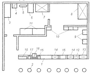 11 - виробничій стіл; 12 - низькотемпературний прилавок; 13 - електрозмішувач;
