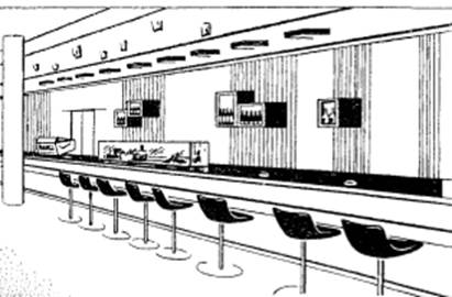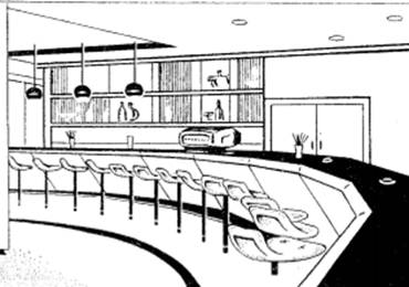 розташування обладнання в барі на 100 місць: 1 - стійка барна; 2 - стільці