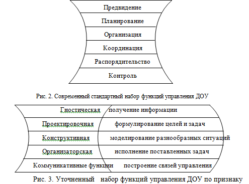 Функции не изменились на другие, они обогатились, расширились внутри своего функционала благодаря новым методам управления. На современном этапе закономерности, происходящие в социально-экономическом развитии общества, требуют специфических организационных действий, определенных управленческих решений не только по проблемам образования, но и всех проблем, какие только могут возникнуть как у любого предприятия, функционирующего в рыночной экономике. Более того, в первом параграфе уже было выявлено, что происходит обновление методов создания условий эффективной целенаправленной управленческой деятельности путем взаимодействия этих социально-экономических и педагогических условий, что и порождает маркетинговое управление. Таким образом, нашим исследованием мы хотим обогатить стандартный набор функций управления ДОУ функцией маркетингового управления, тем самым обогатить данный набор новыми экономическими и гностическими методами управления.