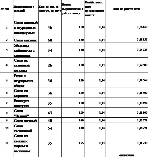 Расчет производится с учетом всего ассортимента изготавливаемой продукции, блюд, напитков, изделий предприятия за день, а так же с использованием норм времени для приготовления данного ассортимента