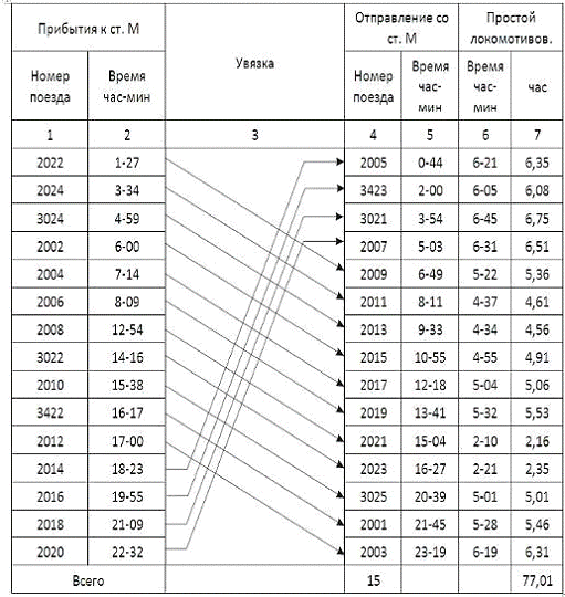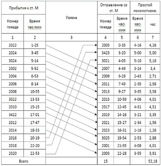 Таблица 7.9 Ведомость оборота локомотивов на станции М (I-вариант)