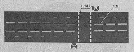 д) двойными прерывистыми линиями 1.9 в тех случаях, когда направление движения по полосе может изменяться на противоположное (реверсивная полоса).