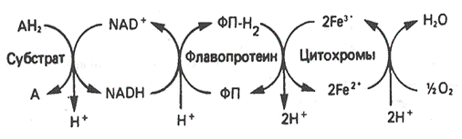 далее идет через ряд цитохромов к молукелярному кислороду (рис 1.3). Цитохромы
