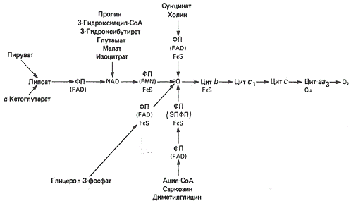 Главная дыхательная цепь начинается от NAD-зависимых дегидрогеназ, проходит через флавопротеины и цитохромы и заканчивается молекулярным кислородом. Не все субстраты связаны с дыхательной цепью через NAD-зависимые дигидрогеназы; некоторые из них, имеющие относительно высокий окислительно-восстановительный потенциал (например, система фумарат/сукцинат, связаны с флавопротеиновымидегидрогеназами, которые в свою очередь связаны с цитохромами дыхательной цепи (рис. 1.3).