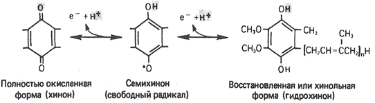 В последнее время установлено, что в дыхательной цепи имеется еще один переносчик, связывающий флавопротеины с цитохромомb, обладающим самым низким среди нитохромовокислительно-восстановительным потенциалом. Этот переносчик названный убихиноном или коферментом Q (рис 1.4), в аэробных условиях находится в митохондриях в форме окисленного хинона, а в анаэробных условиях в восстановительной хинольной форме. Кофермент Q является компонентом митохондриальных липидов; среди других липидов преобладают фосфолипиды, являющиеся частью митохондриальной мембраны. Структура кофермента Q сходна со структурой витаминов К и Е. Близкую структуру имеет и пластохинон, находящийся в хлоропластах. Все эти вещества имеют в своей структуре полиизопреноидную боковую цепь. Содержание кофермента Q значительно превосходит содержание других компонентов дыхательной цепи; это позволяет предположить, что кофермент Q является подвижным компонентом дыхательной цепи, который получает восстановительные эквиваленты от фиксированных флавопротеиновых комплексов и передает их на цитохромы.