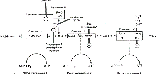 Указаны участки, где предположительно происходит сопряжение с фосфорилированием. BAL- димеркапрол; TTFA- хелатообразующий реагент на железо. Комплекс I-NADH; убихинон-оксидоредуктаза; комплекс II - сукцинат: убихинон-оксидоредуктаза; комплекс III - убихинол: феррицитохром с-оксидоредуктаза; комплекс IV-ферроцитохром с: кислород-оксидоредуктаза.