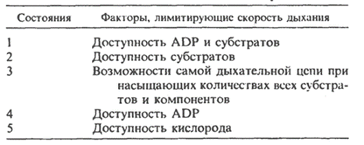 Скорость дыхания митохондрии может контролироваться концентрацией АDP. Это обусловлено тем, что окисление и фосфорилирование жестко сопряжены, т.е. функционирование дыхательной цепи не может осуществляться, если оно не сопровождаетсяфосфорилированиемADP.Чанс и Уильямс предложили рассматривать 5 состояний, при которых скорость дыхания митохондрий лимитируется определенными факторами (табл.1.1)