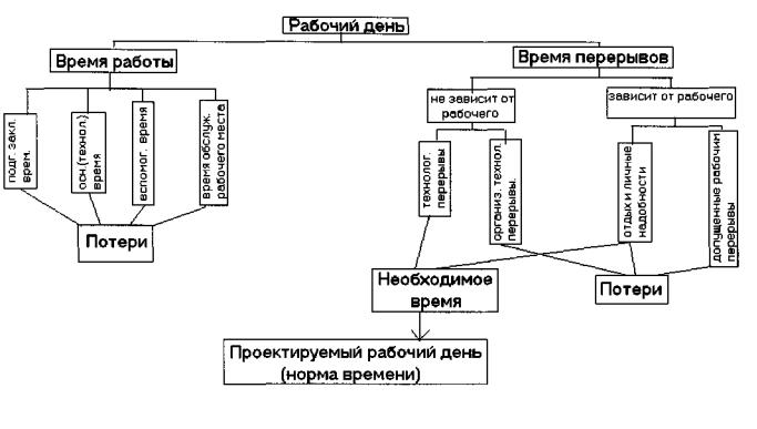 Затраты рабочего вре мени на протяжении рабочего дня (смены) делят на время работы и время перерывов. Время перерывов зависит от рабочего и не зависит от него.