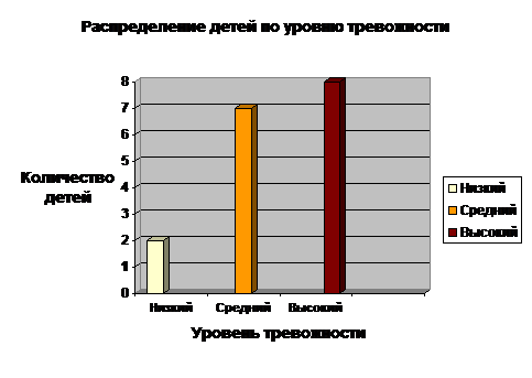 средний уровень, 8 высокий и 2 низкий уровень тревожности. У пяти из семи детей