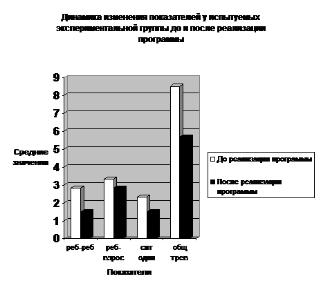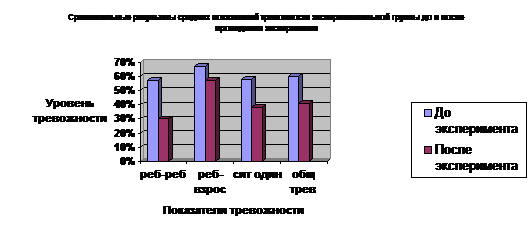 В экспериментальной же группе тревожность по всем показателям существенно снизилась. Наибольшее снижение тревожности в ситуации ребенок-ребенок.