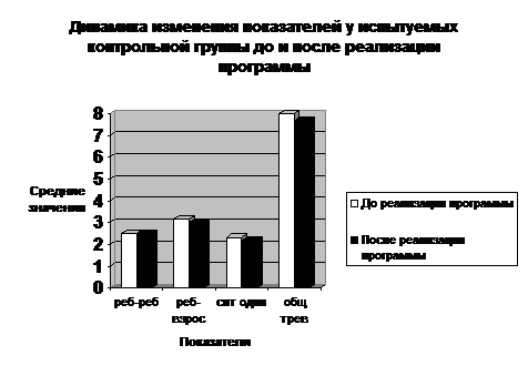 Изменения произошли в контрольной группе не значительные. По одним показателям тревожность чуть повысилась, по другим - чуть снизилась. Отношения ребенок-ребенок остались на прежнем уровне. Отношения ребенок - взрослый снизились. Причина лежит в том, что с воспитателем, работающим на группе, была проведена работа. Она реализовывала часть программы по снижению тревожности в экспериментальной группе корректируя всю свою работу во всей группе. Тем самым создавая благоприятную психологическую атмосферу для всех детей как экспериментальной, так и контрольной групп. Это же, на наш взгляд, привело к снижению тревожности в ситуации одиночества. И как следствие снижение общей тревожности детей. Статистически не значимо, но тем не менее есть.