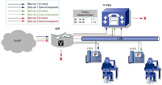 При поступлении первого звонка из ТфОП на номер 961-14-10 голосовой шлюз (GW) по протоколу сигнализации запрашивает у телефонной станции (IP PBX): «Что делать со звонком?» IP PBX, просмотрев информацию в таблице маршрутизации, принимает решение о переключении вызова на IP-телефон 1111: IP-телефон начинает «звонить» (звонящий слышит гудки), а после того как оператор снимет трубку, IP PBX дает команду голосовому шлюзу (GW) на установление прямого голосового соединения с IP-телефоном (1111) (Рисунок 12). Таким образом, «тяжелый» голосовой трафик передается по LAN только после того, как была поднята трубка, и только между двумя устройствами: GW и IP-телефоном.