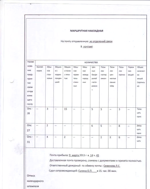 пачек с печатью к почтовым шкафам опорных пунктов и др.