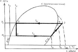 т1-всасывание, пр 1-2 адиабатическое сжатие пара, пр 2-а пары охлаждаются от температуры перегрева до температуры конденсации, процесс 3-4 изоэнтальпический - понижение давления и температуры; процесс 4-1-хлад.аг.кипит.