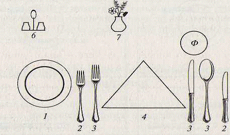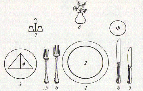 - закусочный прибор, 4 - столовый прибор, 5 - полотняная салфетка, 6 - фужер