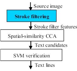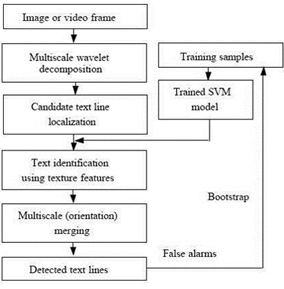 Чтобы классифицировать блок изображения в текстовый или не текстовый различными моделями классификаторов, в алгоритме предложена другая структура обнаружения. Она использует эти четыре свойства. В грубом обнаружении блоки текста получаются исходя из первого и второго свойств, предполагая, что у всех текстовых областей есть плотное разнообразие интенсивности и контраст с фоном. Затем эти текстовые области с помощью третьего свойства разделяются на текстовые строки, а свойство четыре используется, чтобы отличить текст от других нетекстовых шаблонов, плотное разнообразие интенсивности которых подобно тексту.