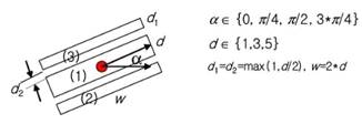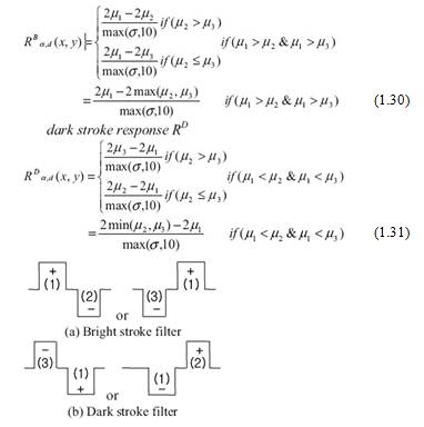 Для каждого пикселя в изображении вычисляется отклик штрихового фильтра (рисунок 1.23). Центральная точка обозначает пиксель изображения, вокруг которого есть три прямоугольных области. [17]