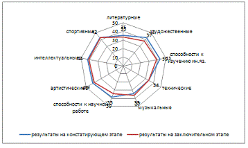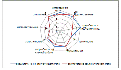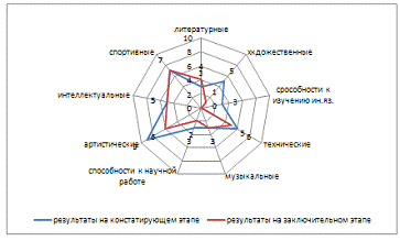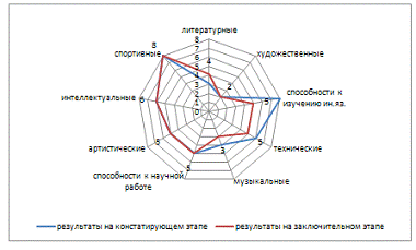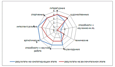 способностей к научной работе на 1 балл, артистические увеличились на 3 балла,
