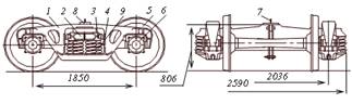- боковая рама; 2 - надрессорная балка; 3 - клиновой фрикционный гаситель колебаний; 4 - фрикционная планка; 5 - колесная пара; 6 - букса; 7 - шкворень; 8 - скользун; 9 - рессорный комплект