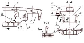 - бурт; 2 - отлив; 3 - втулка; 4 - кронштейн; 5 - планка фрикционная; 6 - направляющие клина; 7 - опорная плита; 8 - заклепка; 9 - площадка для поддомкрачивания; 10 - полка предохранительная; 11 - полка для балки авторежима