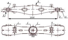 На концевых частях балки имеются наклонные под углом 45° к плоскости А, взаимодействующие с наклонными плоскостями фрикционных клиньев гасителей колебаний. Челюсти 4 служат направляющими для фрикционных клиньев и ограничивают их перемещения. При ремонте наклонных поверхностей за базу принимается нижняя опорная плоскость Б и установочные бонки 5. Бонки 6 служат для фиксации пружин. На боковой стенке балки, в средней части, расположены приливы для крепления державки мертвой точки 3 тормозной рычажной передачи.