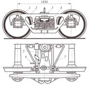 Тележка состоит из двух колесных пар с буксами 1; двух боковых рам 2; подпятника 3; рессорного подвешивания 4; надрсссорной балки 5; устройства отвода колодок 6; тормозной рычажной передачи 7.