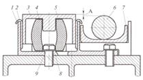 Упругокатковый скользун состоит из износостойкого элемента 1; корпуса 2; колпака 3; прокладки 4; упругого элемента 5 (демпфера); ролика 6; вкладыша 7; стопорных шайб 8; болта 9.