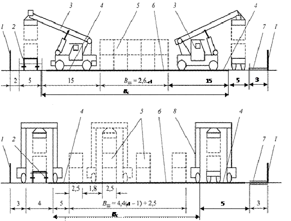 Условные обозначения: 1 - ограждение терминала, 2 - железнодорожный погрузочно-разгрузочный путь, 3 - автопогрузчик с выдвижной крановой стрелой (ричстакер), 4 - автопроезды, 5 - штабели контейнеров,6 - покрытие контейнерной площадки, 7 - пешеходные тротуары, 8 - портальный автопогрузчик, d-число контейнеров, размещающихся по ширине площадки, Bc - ширина контейнерной площадки, Вш - ширина шитабеля.