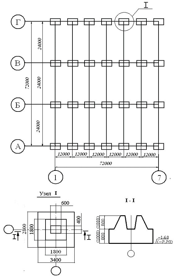 На плане и разрезе фундаментов